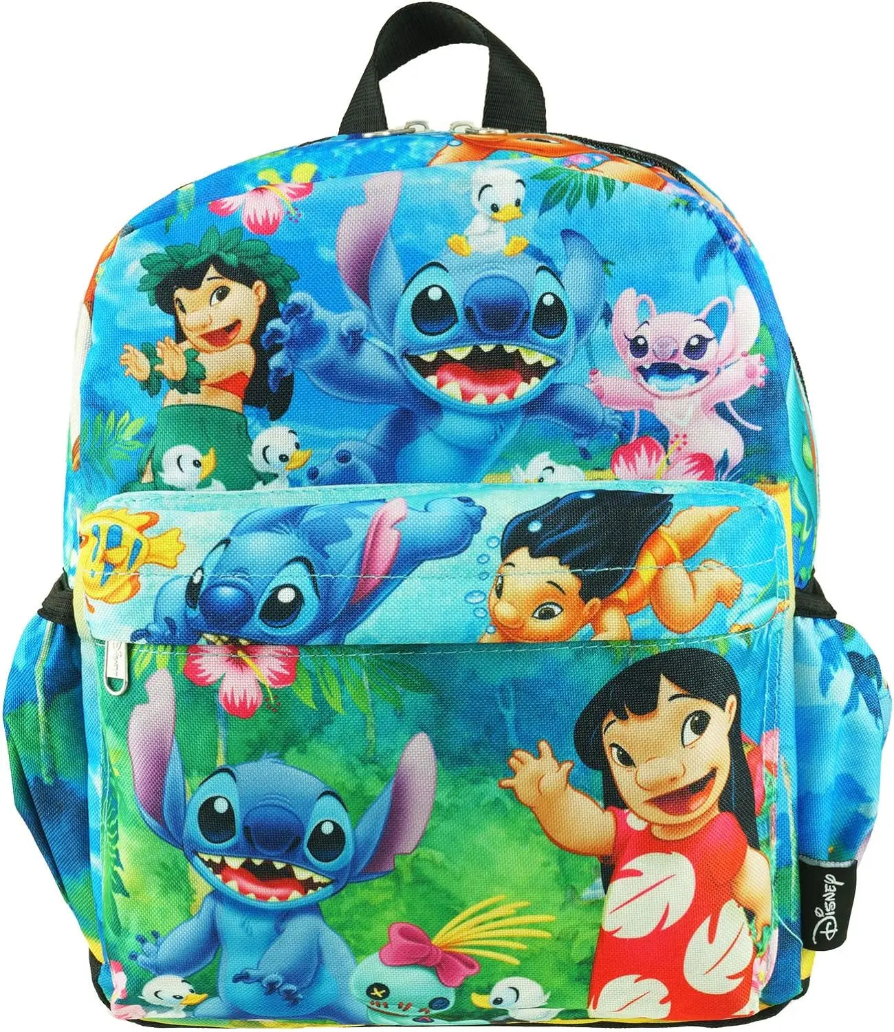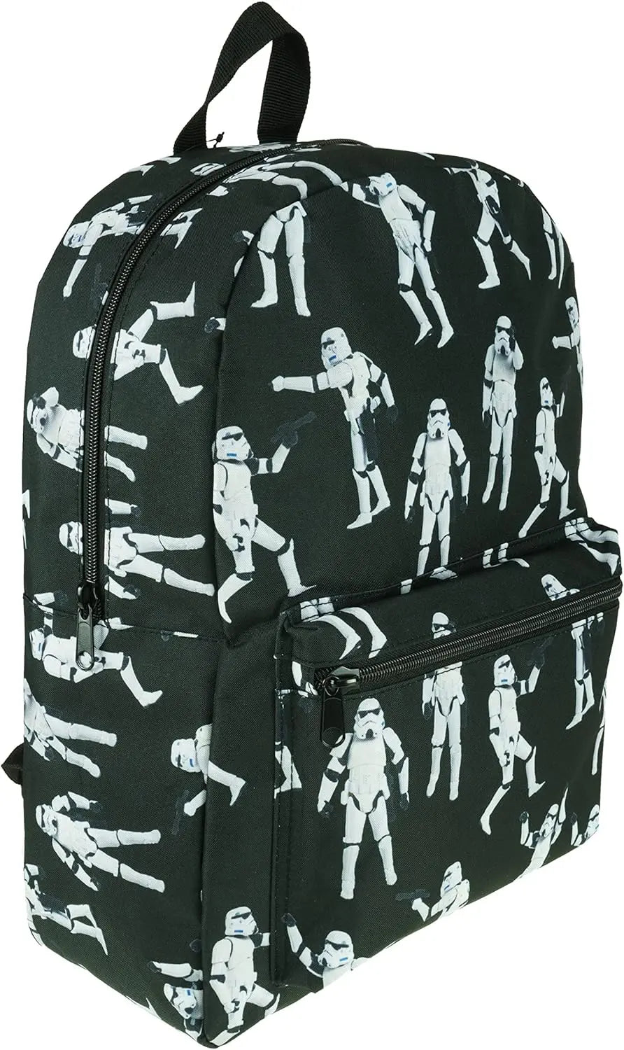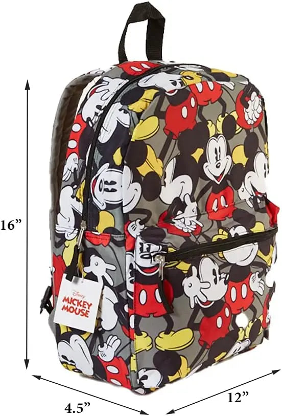 For example, we have the lilo and stitch disney backpack. It is available as 12-inch deluxe oversize design and as 12-inch junior deluxe oversize design. Then we have the mickey and friends backpack that is 16 inches in size and features the characters printed all over. You can also find star wars trooper backpack, which has a black background and troopers printed all over.